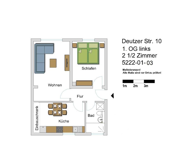 Von der Diele aus sind alle Wohnräume zugänglich. Die Wohnung verfügt über ein Wohnzimmer, ein Schlafzimmer, eine Küche und ein neu saniertes Tageslichtbad mit Dusche.