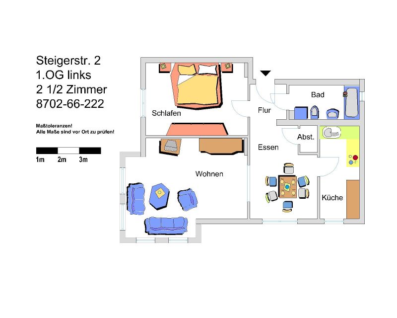 Die Wohnung verfügt über ein großzügig geschnittenes helles Wohnzimmer mit Eßbreich, ein Badezimmer mit Wannenbad und Fenster, ein Schlafzimmer, einen Abstellraum, eine Küche.